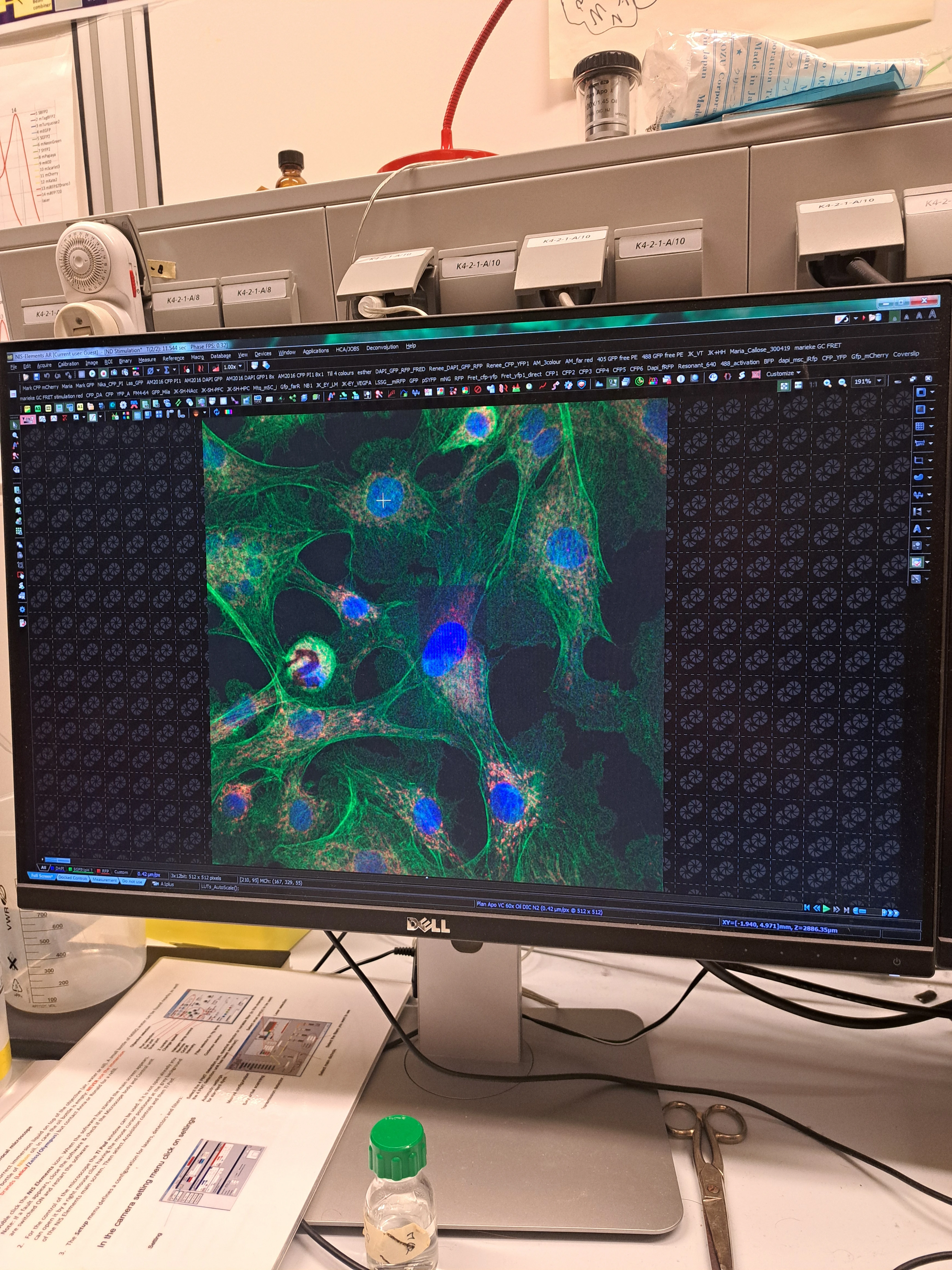 On our first day in the microscopy lab, we finished early and had a bit of extra time so our supervisor suggested we play with the lasers. We decided to vandalise some cells by bleaching them (i.e. destroy the fluorescent molecule on them), and emblasoned them with a '2', since we were group 2.